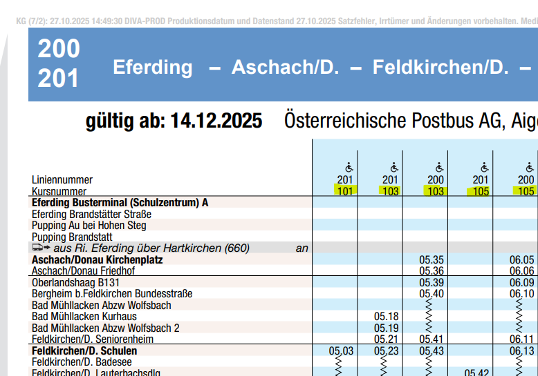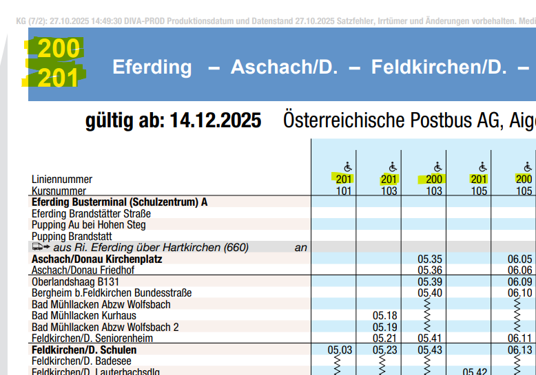 Beispiel: Dieser Fahrplan ist für die Linie 200 bzw. 201.