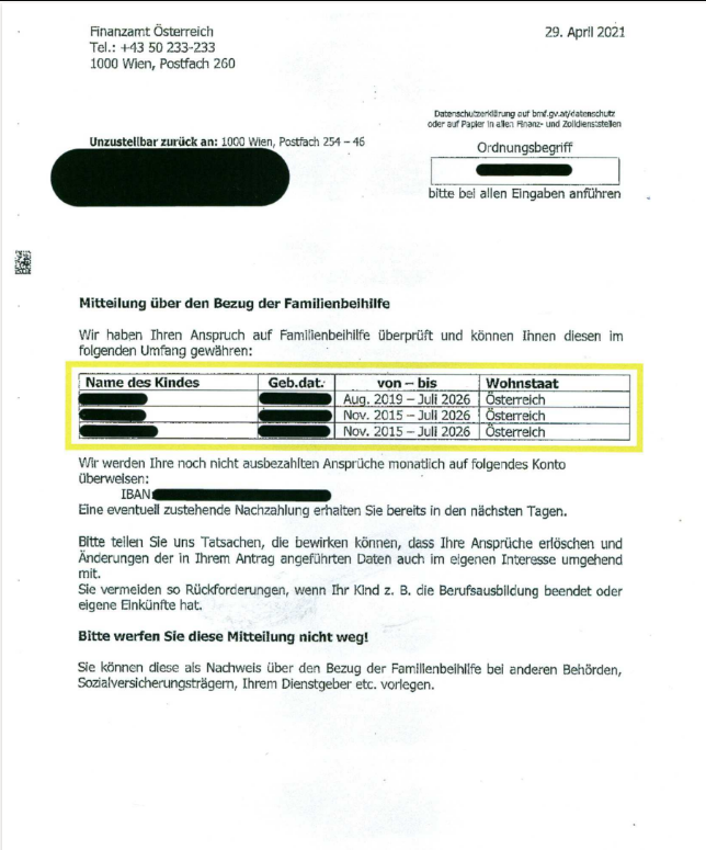 Die Bestätigung über den Bezug der Familienbeihilfe erhalten Sie bei Ihrem Finanzamt.