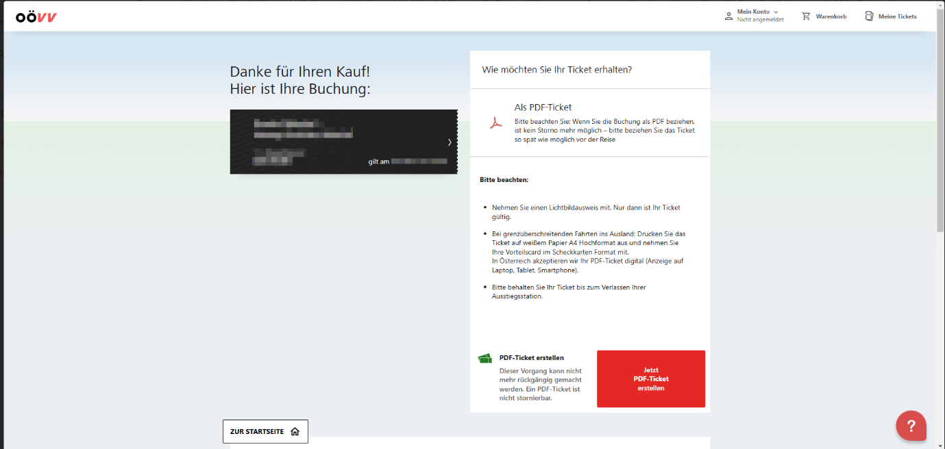 Falls nicht, kommen Sie auf die unten dargestellte Bestätigungsseite im Ticketshop, mit der Möglichkeit das Ticket als PDF herunterzuladen.