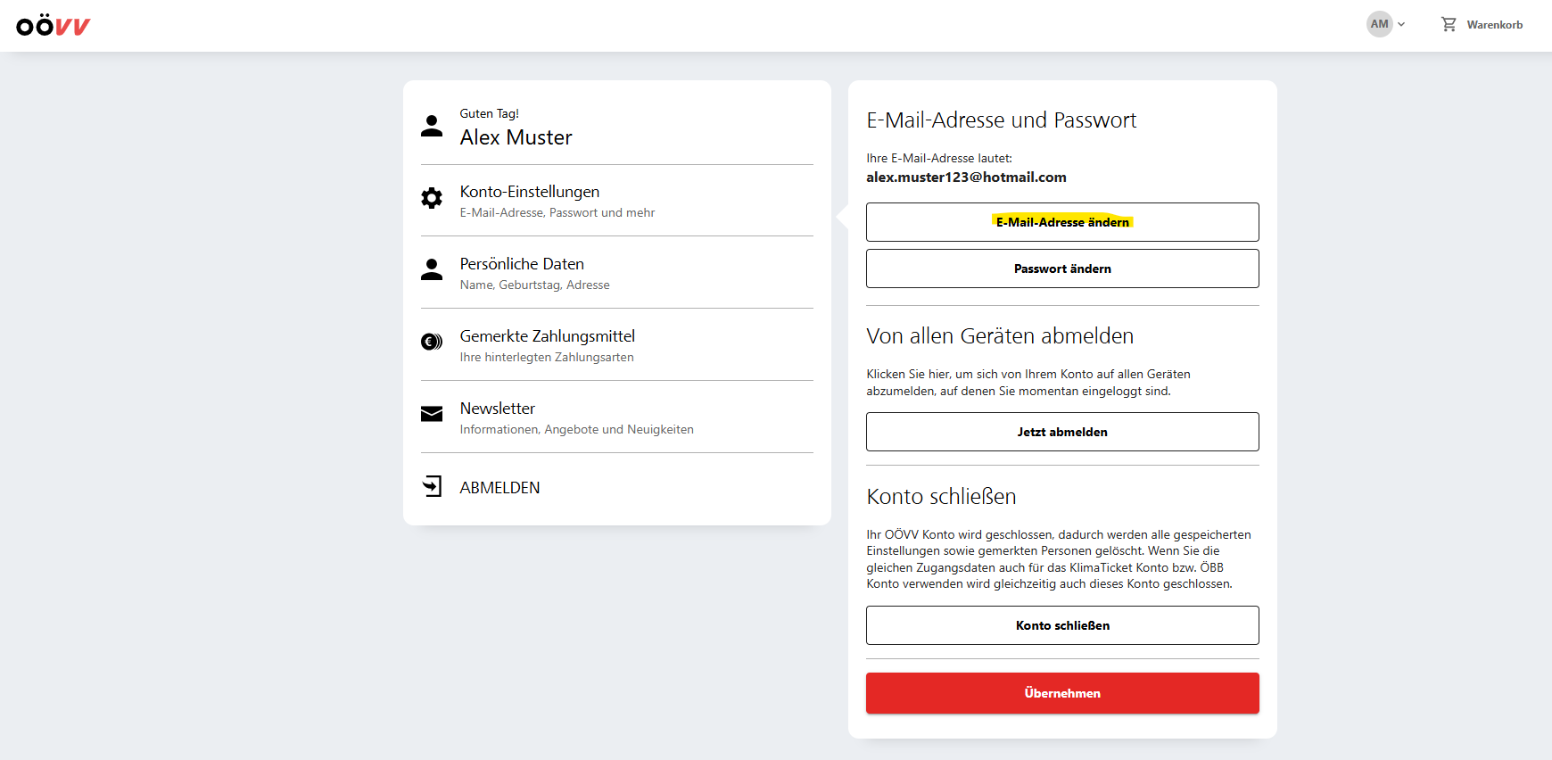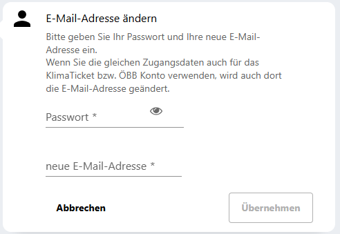 - Wenn Sie die gleichen Zugangsdaten auch für das KlimaTicket Ö bzw. ÖBB Konto verwenden, wird auch dort die E-Mail-Adresse geändert.